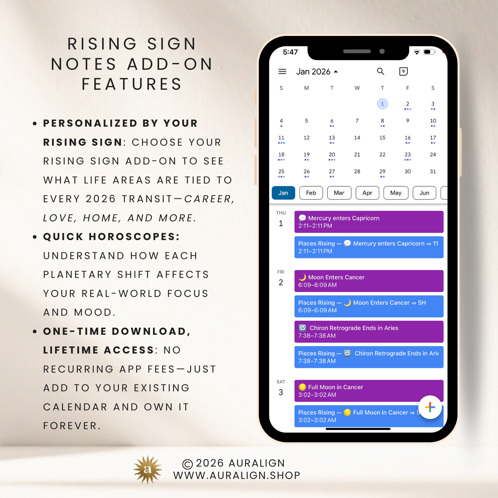 The Auralign Digital Astrology Calendar automatically adds 2026’s most important astrological events including planet transits, retrogrades, eclipses and moon phases  directly into your favorite calendar app.